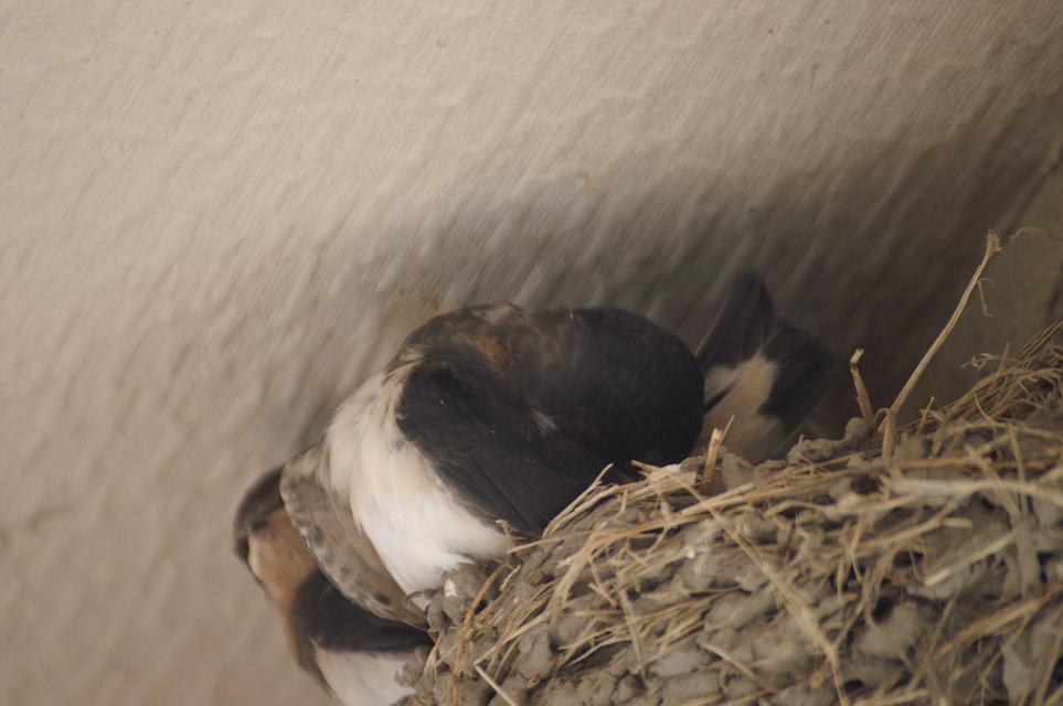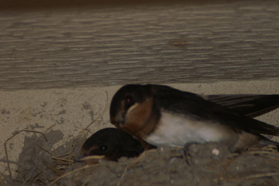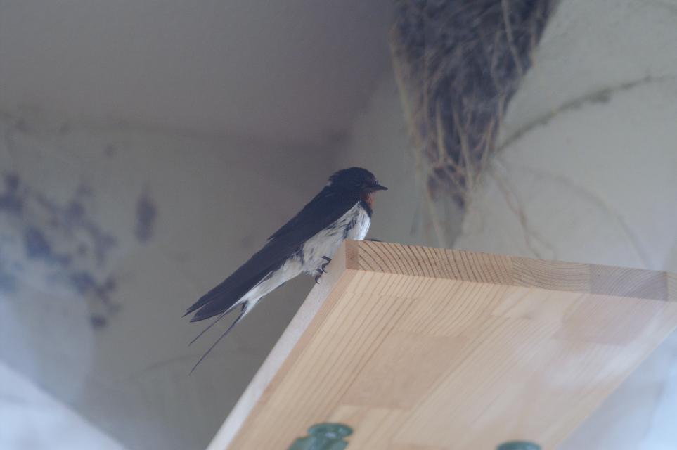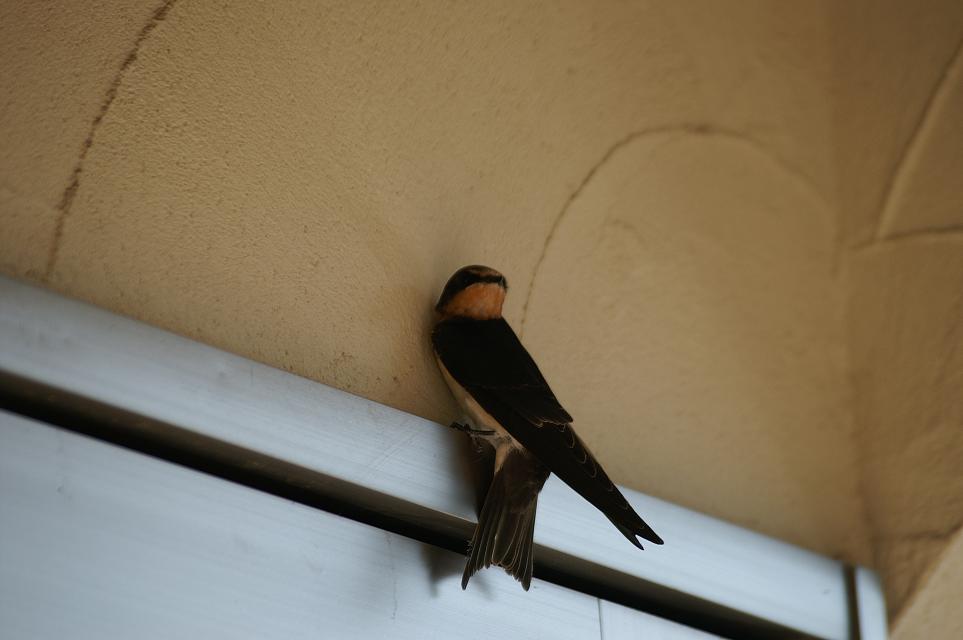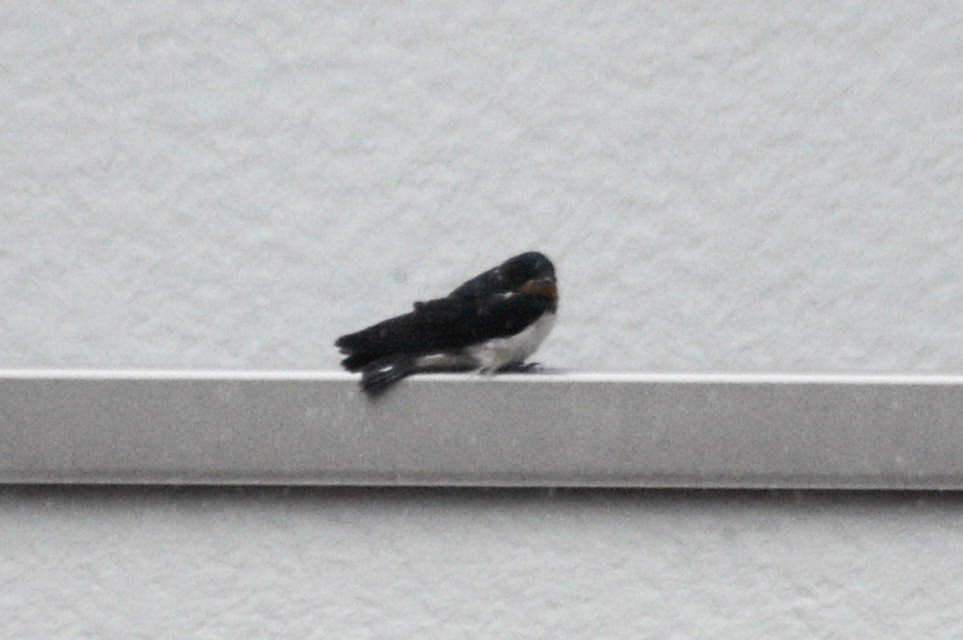 巣の中は1羽だけ?お向かいの2Fベランダ手すりに、なにやら燕尾の短い奴が居るではないですか
