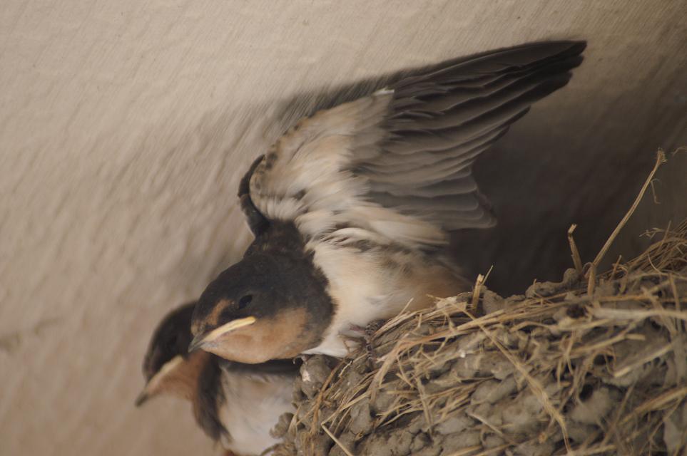 雛が巣の淵に止まり、羽ばたきのブレークインをしています。
