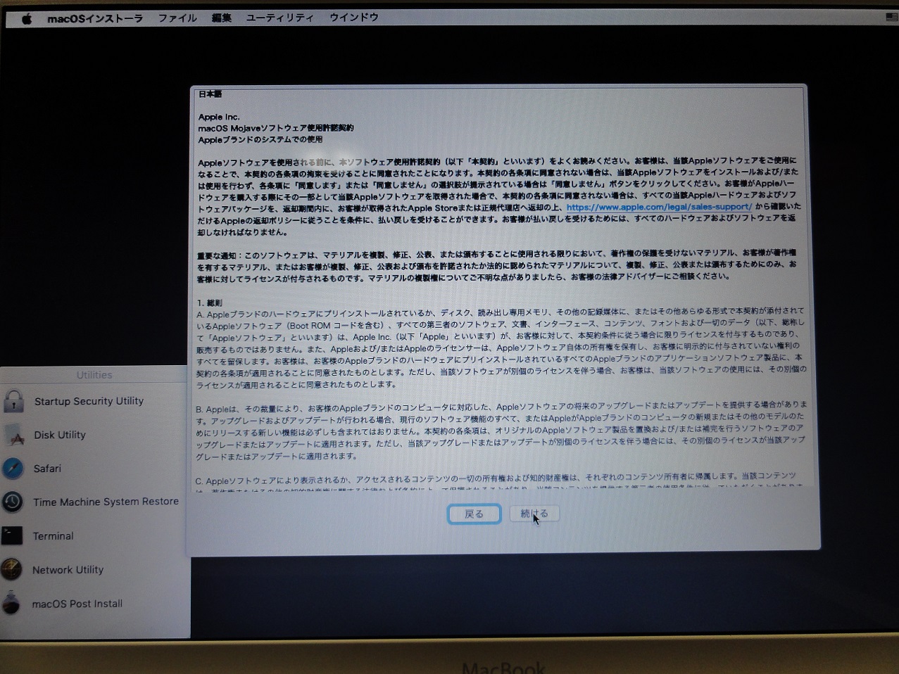 「続ける」をクリック、ソフトウェア使用許諾契約画面が出たら